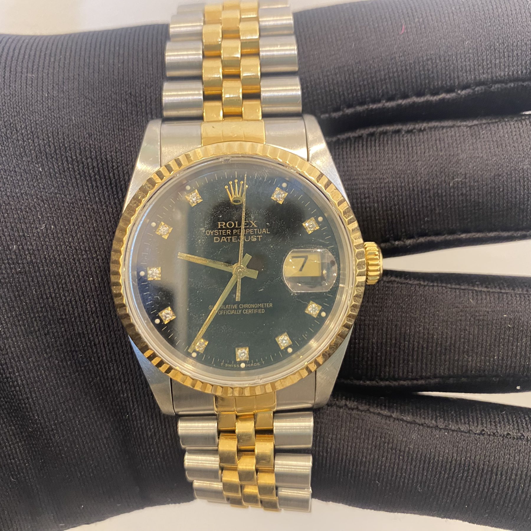 This Rolex Datejust 16233 isn’t in perfect condition. The glass is chipped, the Jubilee bracelet hangs a little loose, the dial has faded with time, and the clock hands have tarnished. It’s clearly been worn — maybe passed down, maybe left in a drawer for years.